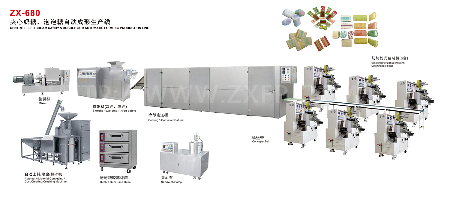 本自動(dòng)生產(chǎn)線集成形、切塊、包裝為一體,適用于奶糖、泡泡糖的成形、切塊、包裝,具有生產(chǎn)效率高、次糖少的優(yōu)點(diǎn)。