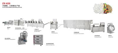 整套生產(chǎn)線由攪拌機(jī)、夾心泵、擠出機(jī)、冷卻輸送柜、方型夾醬成型機(jī)(可配6臺(tái))、糖衣缸、膠基烤箱組成。